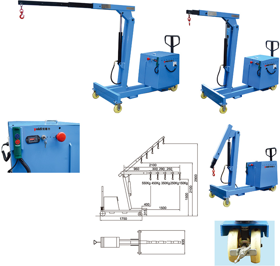 ● 吊臂長度可五工 位手動調節,配有鍛造重載可旋轉吊鉤。